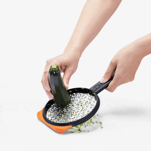 This amazing two-sided grater from Dreamfarm allows you to continuously grate in a circular motion on one side and an up and down motion on the other. Your grating speed is doubled as you grate in both your up and down motions, with an extra wide plane for large foods.. When using the bottom side you grate in a continuous circular motion. The bottom side includes a guide rim so that you may easily grate in either direction. A snap-on safety cover protects both sides of the razor sharp blades for no-worries drawer storage. A non-slip foot gives control when grating on a flat surface, works as a scraper, and also hooks on to the edge of a bowl.