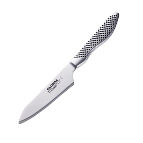 Global’s GS series are small and medium-sized Japanese knives for general kitchen use. They are made of Cromova 18, a high quality stainless steel. The 18% Chromium makes them stain resistant while molybdenum and vanadium improve edge retention. Global knives are actually ground on both sides so the blade tapers narrower and narrower right to the edge. The result is a razor sharp blade which remains sharp much longer and requires sharpening less frequently. The handle is hollow and filled with sand to provide proper balance. It has a dimpled or dotted finish which is elegant and makes for a sure grip. Some of Global’s most user friendly knives are the mid-range utility knives. You will find a utility knife extremely useful for slicing fruits and vegetables, peeling and chopping small items such as mushrooms or shallots and many other kitchen tasks -, even boning a chicken. Hand wash only with mild dish soap and warm water, rinse well, and dry the knife with a towel immediately. Do not place it in the dishwasher. Made in Japan
