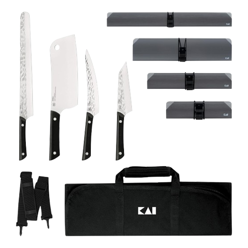 This BBQ set by KAI PRO has four key tools needed for grilled meats of all types, from prime rib to poultry. The cleaver handles larger cuts of bone-in meat; the Asian multi-prep breaks down poultry quickly and also works as a general prep knife for grilled vegetables; the boning/fillet knife gets in close to the bone; and the slicing/brisket knife creates perfect, mouth-watering slices. A handsome knife roll and blade guards for each knife allows you to travel with your tools easily. The PRO line offers professional level performance with high-carbon Japanese AUS6M stainless steel, and finished to a 16 degree blade on each side for quick, easy cutting. Set includes: 5” Asian Multi-Prep 6.5” Boning/Fillet 7” Cleaver 12” Brisket/Slicing Knife Roll