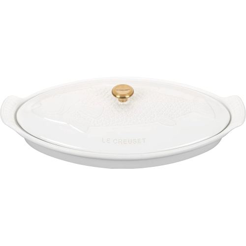 Le Creuset 1.75 Quart Fish Baker – White with Gold Knob