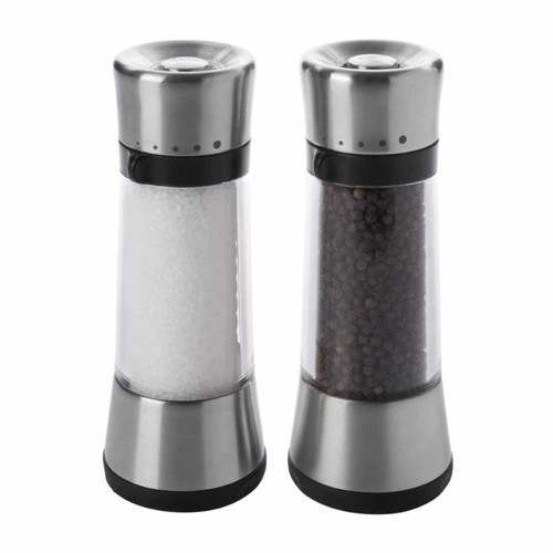 OXO™'s Sleek Adjustable Salt and Pepper Mill set has a top-grind design that offers mess-free storage- no more salt or pepper left on the counter or table. A wide opening on the bottom makes refilling the mills easy.