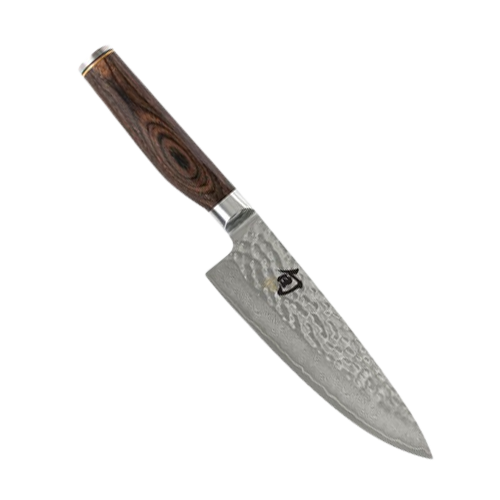 Shun Premier knives combine a number of advanced elements to truly stand apart from the crowd. The core of the Premier blade is VG-Max steel which is supported by 34 layers of stainless steel on each side of the blade. The layering of steel on the blade creates a Damascus finish which is hammered for a breathtaking finish! The VG-Max steel, hardened to 61 degrees Rockwell, creates the cutting edge of the blade. It is designed to handle being sharpened to a very narrow angle. It will also hold its razor sharp edge for a long time, needing infrequent sharpening. The hand hammered finish reduces friction and keeps foods from sticking to the blade. The beautiful PakkaWood handle is as comfortable as it is beautiful. The aesthetic of the Premier line catches your eye and the extraordinary performance seals the deal. Hand Wash these pieces with mild dish soap, rinse thoroughly, and dry completely. Handcrafted in Japan. Features: VG-Max steel hardened to 61 degrees Rockwell 34 layers of protective stainless steel on each side of the blade for the dramatic Damascus finish Sharpened to 16 degrees on each side of the blade for extreme sharpness Hammered blade keeps food from sticking Ergonomic Walnut Pakkawood handle for comfort and presentation Hand Wash Recommended Made in Japan Lifetime Warranty