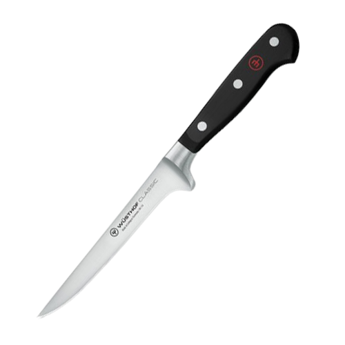 This boning knife is perfect for removing bones, in pork, beef, or chicken. A long, narrow, curved blade moves cleanly along the bones.