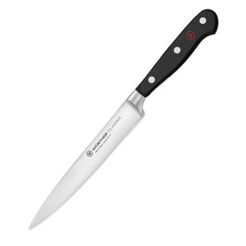 Wusthof’s Classic 6” utility knife is perfect for many kitchen tasks, being small than a chef’s knife but larger than a paring knife. Use it for mincing shallots, onions, herbs and for cutting vegetables or small meats. The Classic series has been tried and tested for generations, their bread and butter.