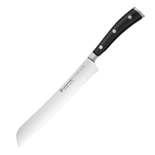 Wusthof Classic Ikon knives combine the sleek, sophisticated elegance of a high-performance knife with the precision and durability of an all-purpose kitchen knife. A distinct, double-bolster design offers professional-style heft, beauty, and balance. The shape of the handle is designed for an ergonomic, comfortable grip. The serrated bread knife will slice through crusty bread without reducing the loaf to a pile of crumbs. You will find yourself using it for cutting through delicate foods such as angel food cake, roasts (especially those with crackling), or any foods (including some fruits and vegetables) that have a hard exterior but delicate interior.